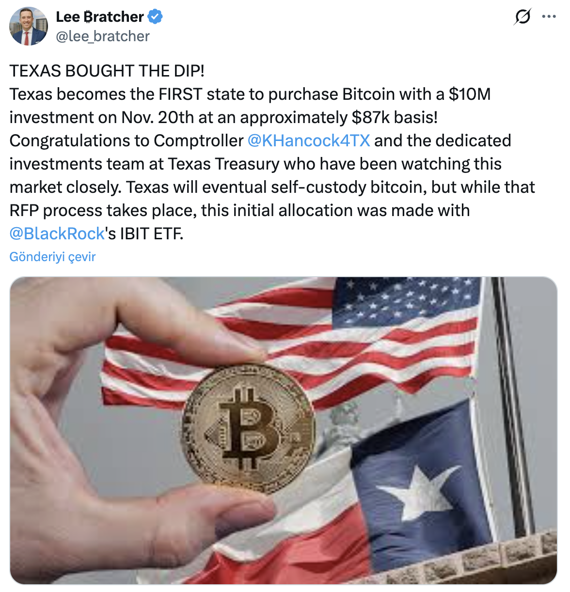 Teksas Blokzincir Konseyi Başkanı Lee Bratcher, kişisel sosyal medya hesabı üzerinden paylaştığı bir gönderide, bu satın alımın 20 Kasım'da gerçekleştiğini açıkladı. Bratcher, Teksas'ın BTC satın alımları için 10 milyon ayırdığını hatırlatarak, "Teksas eninde sonunda kendi Bitcoin'ini kendisi saklayacak," diye yazdı.